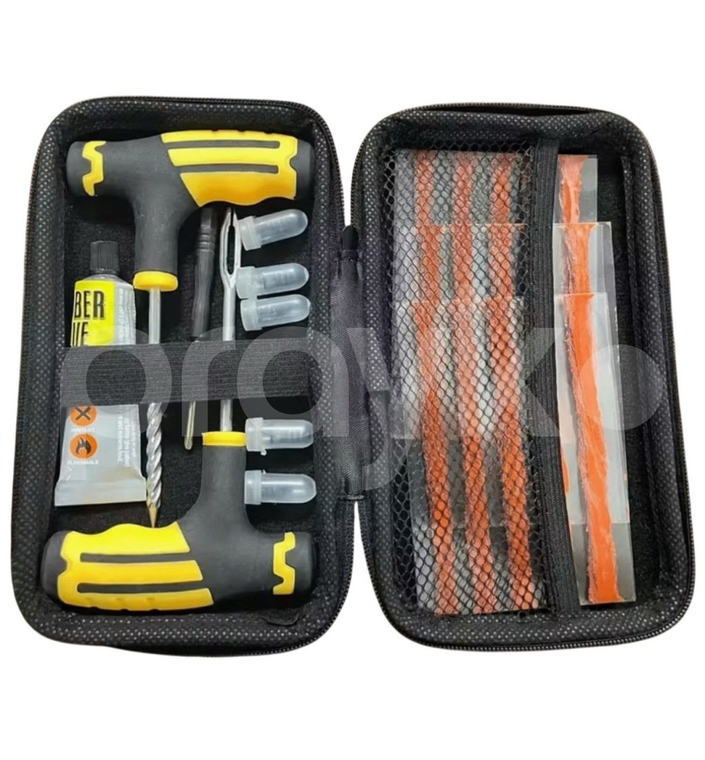 - Sərt qoruyucu futlyarda tam dəst: T formalı rezinlə örtülü iki ədəd saplama tutacağı (delici/reamer və iynə tipli tətbiqçi), spiral delici ucluqlar, tətbiqçi iynəsi, bir neçə ədəd rezin təmir “kord”u (plaq), rezin yapışdırıcı (vulkanizasiya məhlulu), ehtiyat uclar üçün qapaqlar, pincet və aksesuarlar.