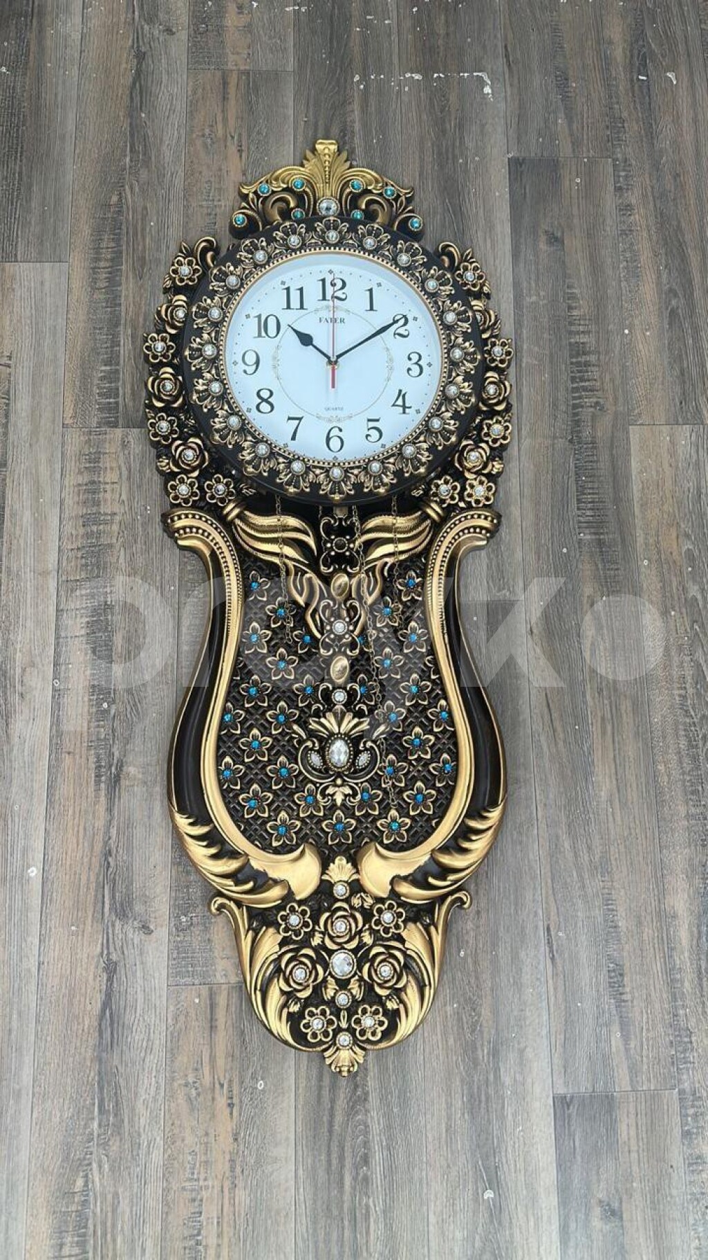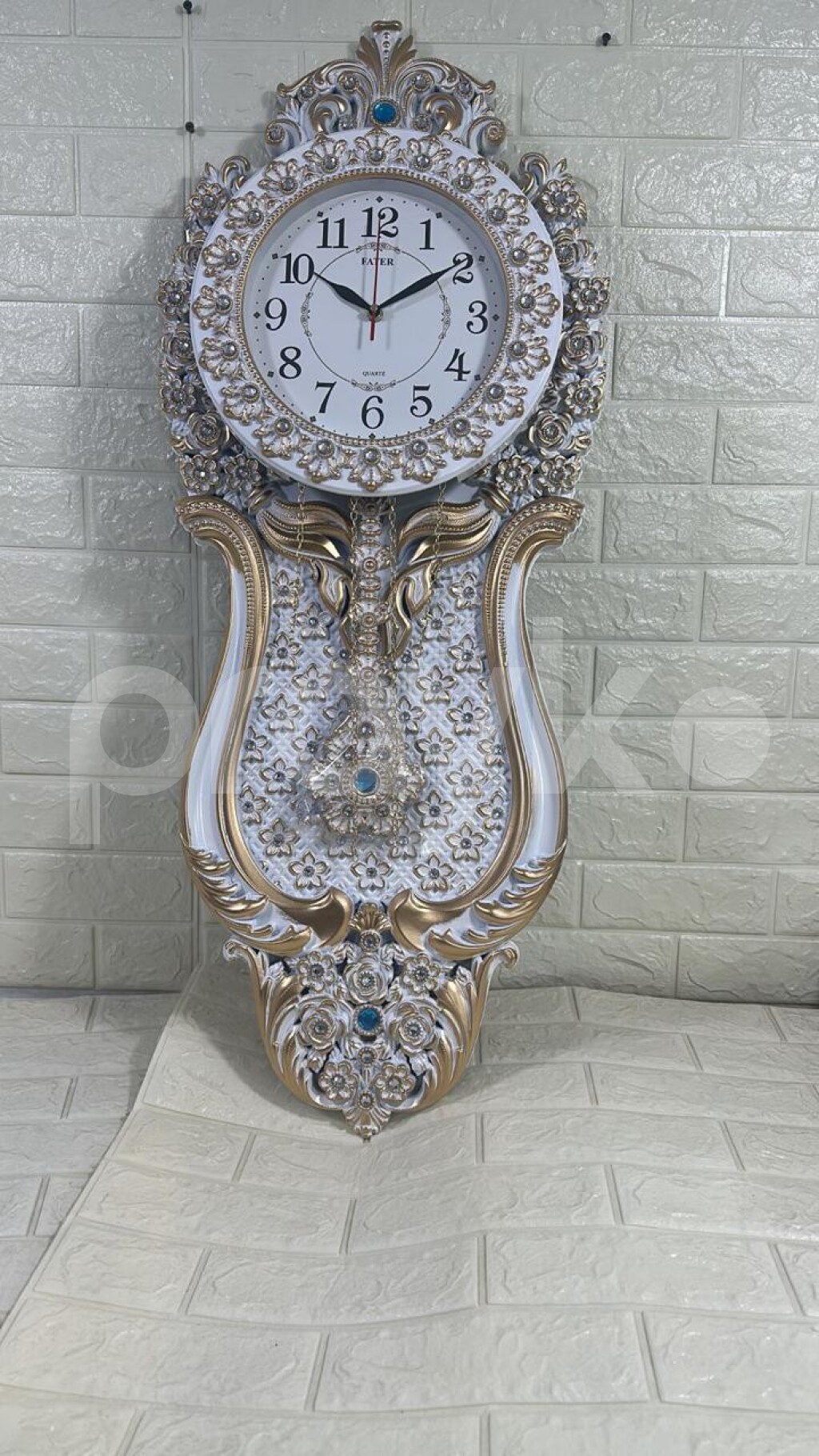 Klassik üslubda bəzədilmiş ağ və qızılı rəngli lüks dekorativ divar saatıdır. Təyinatı: Ev və ya ofis interyeri üçün dekorativ element. Dizayn: Çiçək motivləri və daşlarla işlənmiş klassik çərçivə. Xüsusiyyət: Asılqan (sarkaç) hissəsinə malik böyük model. İstifadə yeri: Qonaq otağı və ya geniş zallar üçün uyğundur.