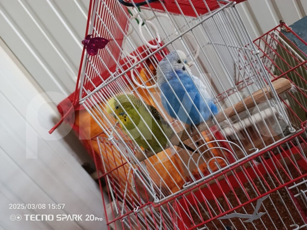 2 quş+ qəfəs + su qabı+ yem qabı +evcik+tor + yem+ yellencek+asılqan+