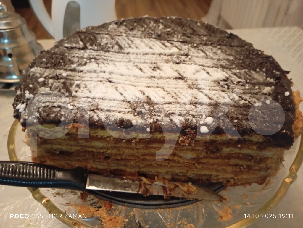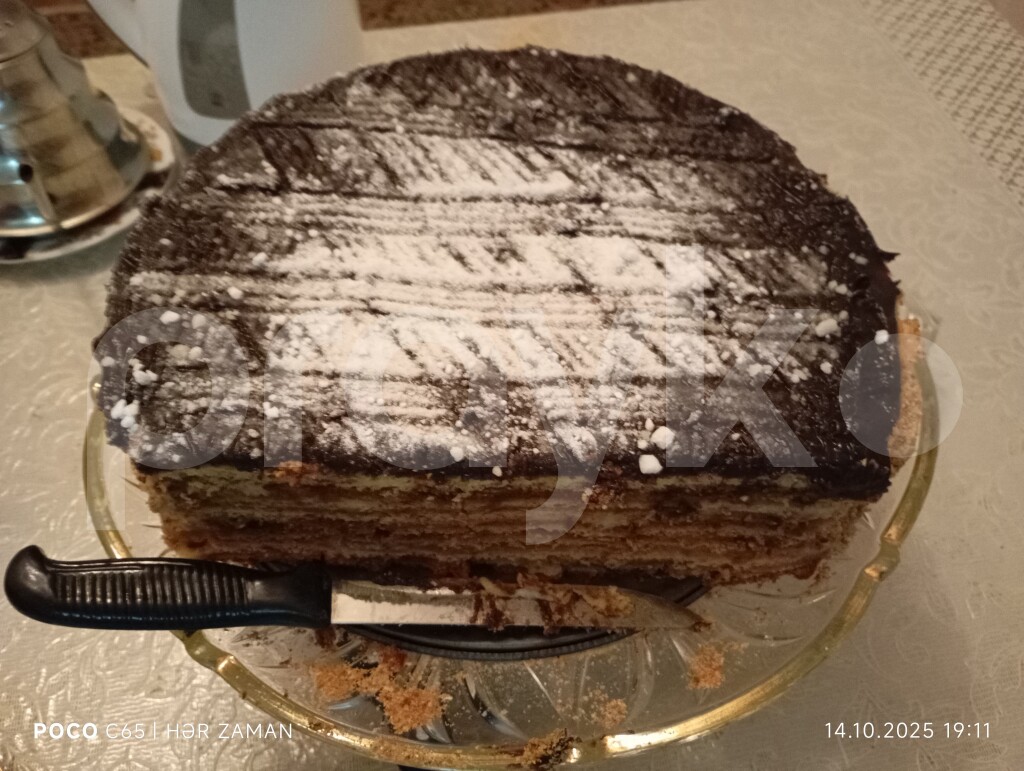 🇦🇿 Ev şəraitində yüksək keyfiyyətli kıassik Ballı TORT. 3 kq Tərkibi: Un, bal, yağ, şəkər tozu, kakao, süd, vanil, yumurta, qida sodası. --- 🇷🇺 Rus dilində: Домашний классический медовый торт высокого качества. 3кг Состав: мука, мёд, масло, сахарная пудра, какао, молоко, ваниль, яйцо, пищевая сода. --- 🇬🇧 İngilis dilində: Homemade classic high-quality honey cake. 3 kq Ingredients: flour, honey, butter, powdered sugar, cocoa, milk, vanilla, egg, baking soda.