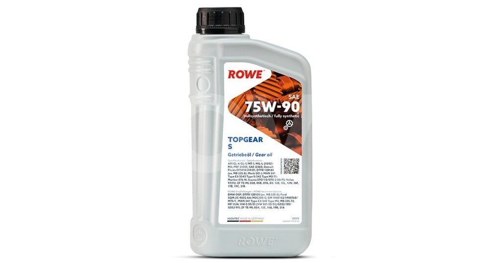ROWE HIGHTEC TOPGEAR SAE 75W-90 S 1L – müasir avtomobil və kommersiya vasitələrinin mexaniki ötürücüləri üçün nəzərdə tutulmuş yüksək keyfiyyətli, tam sintetik baza yağları ilə hazırlanmış çoxfunksiyalı ötürücü mayedir.