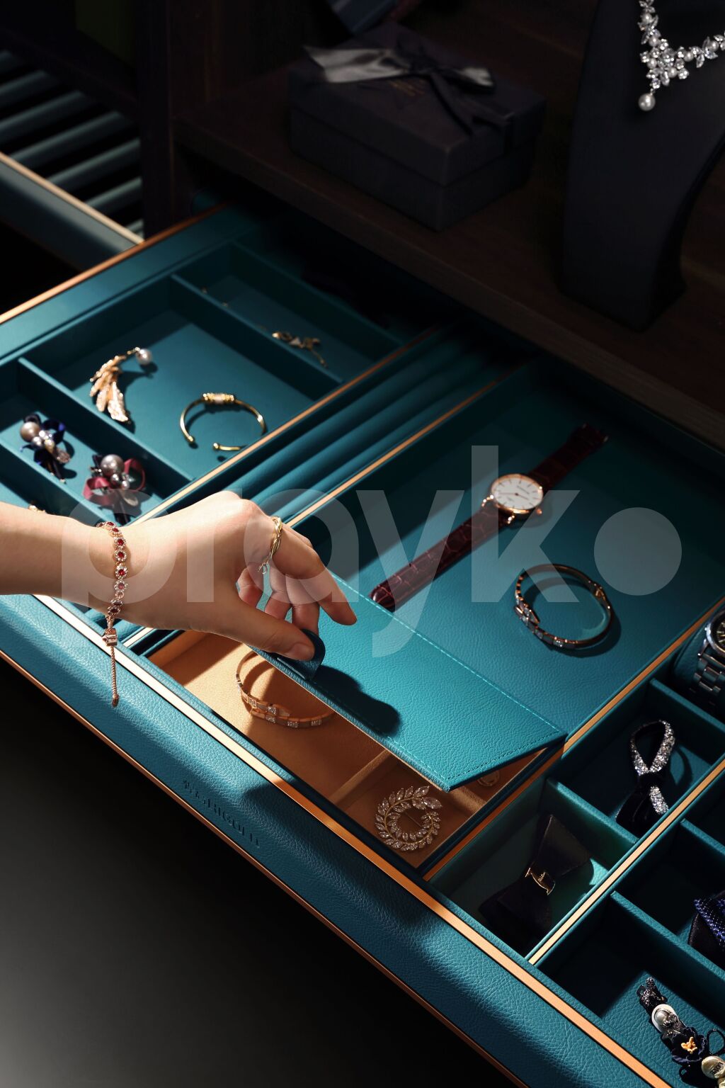 Aksesuarlarınızın dizaynını Higold zərgərlik çəkməcəsi ilə tərtib edin. Çəkməcədə üzüklər, sırğalar, bilərziklər, saatlar üçün bölmələr, boyunbağıların saxlanması üçün portativ dəri qutu var. Bu zərif saxlama qutusu qiymətli əşyalarınızı təhlükəsiz şəkildə saxlamaqla yanaşı onları asanlıqla əldə oluna bilən edir və hər bir qarderoba incəlik toxunuşu əlavə edir.