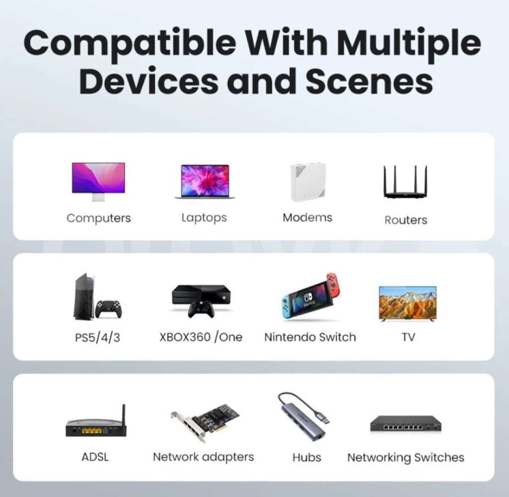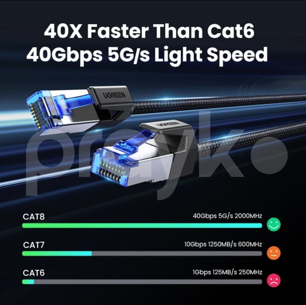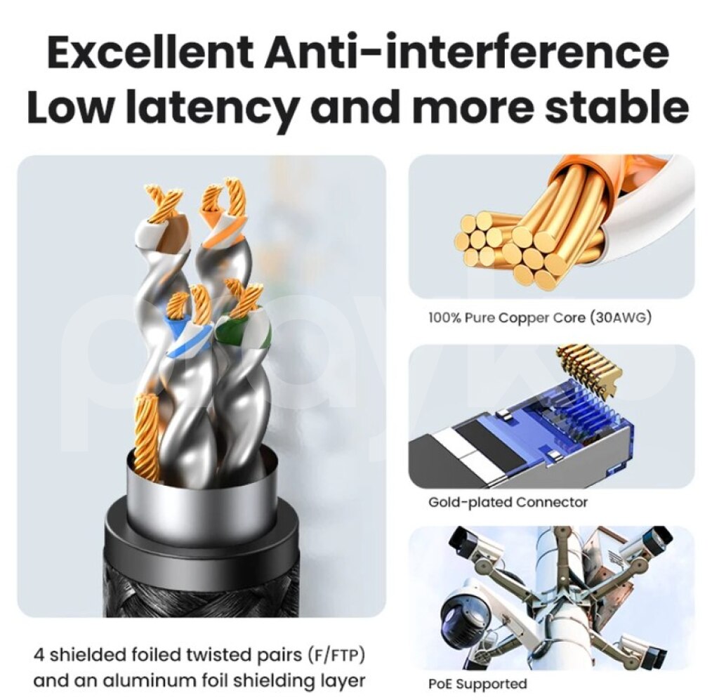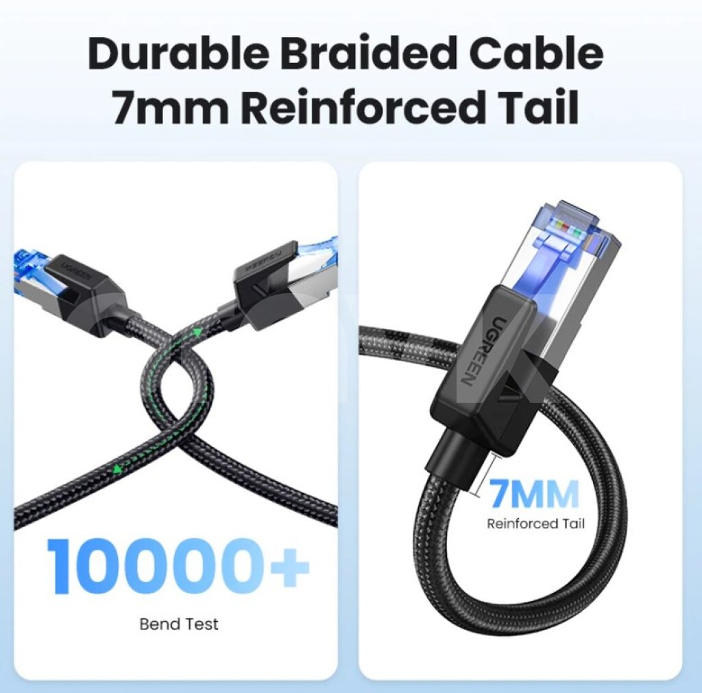 Ugreen firmasının CAT8 sürətli 40.000 Mbps pach cordu .Ps3,ps4,ps5 pc və s istifadə edə bilərsiz. UGREEN Ethernet кабель CAT8 40 Гбит/с 2000 МГц CAT 8 сетевой хлопковый Плетеный Интернет Lan шнур для ноутбуков PS 4 маршрутизатор RJ45 кабель UGREEN CAT8 Ethernet Cable 40Gbps 2000MHz CAT 8 Networking Cotton Braided Internet Lan Cord for Laptops PS 4 Router RJ45 Cable • PoE Supported:Supports PoE power supply, simplifying installation for devices like cameras. • Cat 3|Ethernet Wire|40Gbps High Speed:Achieve lightning-fast data transmission with 40Gbps, perfect for gaming and HD streaming. • Durable Braided Design:Crafted with a durable cotton braided cord, this cable withstands 10,000 bends without breaking. • 2000MHz Bandwidth:Supports a broad 2000MHz bandwidth, ensuring stable and reliable network performance. • F/FTP Double Shielding:Features F/FTP double shielding for minimal interference and enhanced signal integrity.